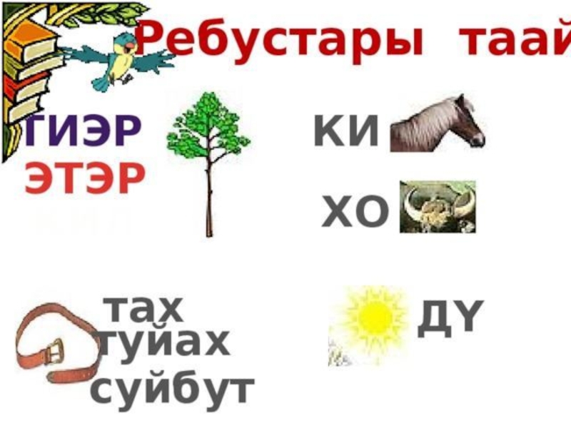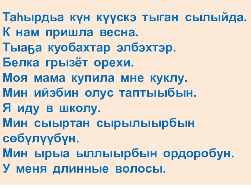 Таhырдьа күн күүскэ тыган сылыйда.К нам пришла весна.Тыаҕа куобахтар элбэхтэр.Белка грызёт орехи.Моя мама купила мне куклу.Мин ийэбин