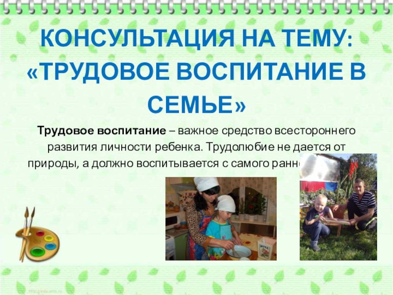Слайд 5КОНСУЛЬТАЦИЯ НА ТЕМУ: «ТРУДОВОЕ ВОСПИТАНИЕ В СЕМЬЕ» Трудовое воспитание – важное средство