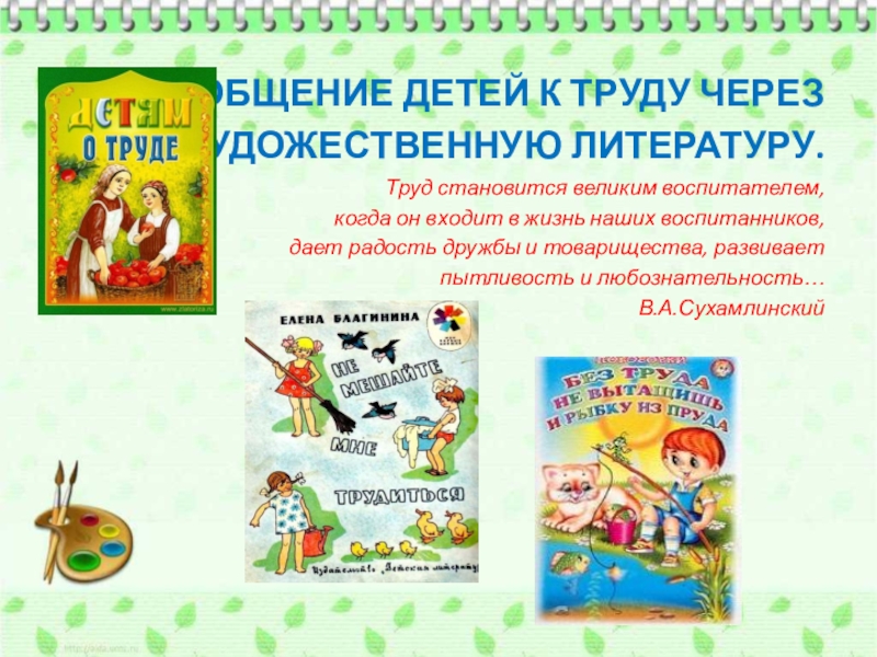 ПРИОБЩЕНИЕ ДЕТЕЙ К ТРУДУ ЧЕРЕЗ ХУДОЖЕСТВЕННУЮ ЛИТЕРАТУРУ. Труд становится великим воспитателем, когда он входит в жизнь наших