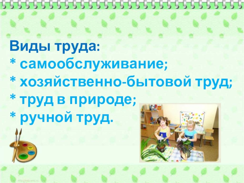 Виды труда: * самообслуживание; * хозяйственно-бытовой труд; * труд в природе; * ручной труд.