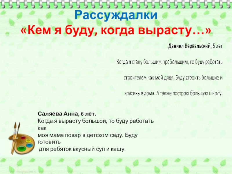 Рассуждалки «Кем я буду, когда вырасту…» Саляева Анна, 6 лет.Когда я вырасту большой, то буду работать как