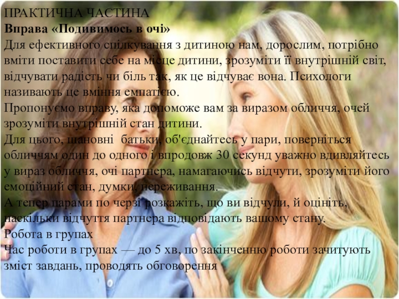 Для цього, шановні батьки, об'єднайтесь у пари, поверніться обличчям один до одного і впродовж 30 секунд уважно вдивляйтесь у вираз обличчя, очі партнера, намагаючись відчути, зрозуміти його емоційний стан, думки, переживання.