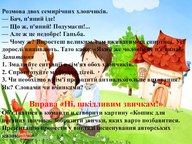 Час роботи в групах — до 5 хв, по закінченню роботи зачитують зміст завдань, проводять обговорення