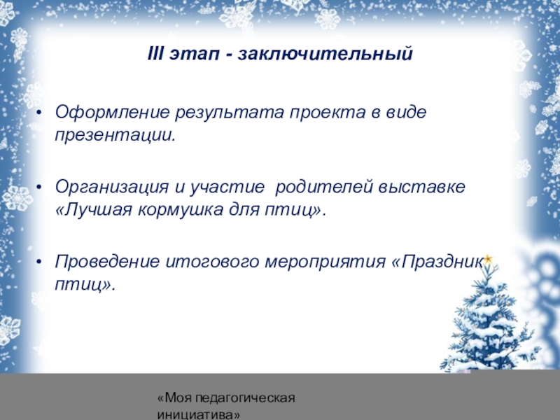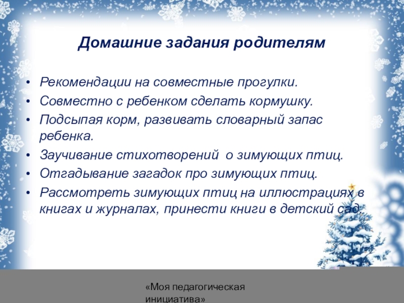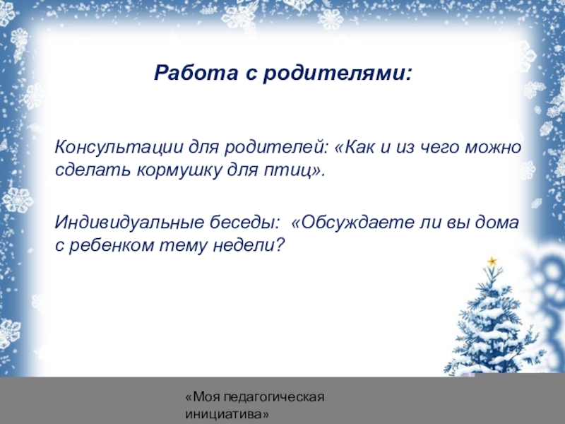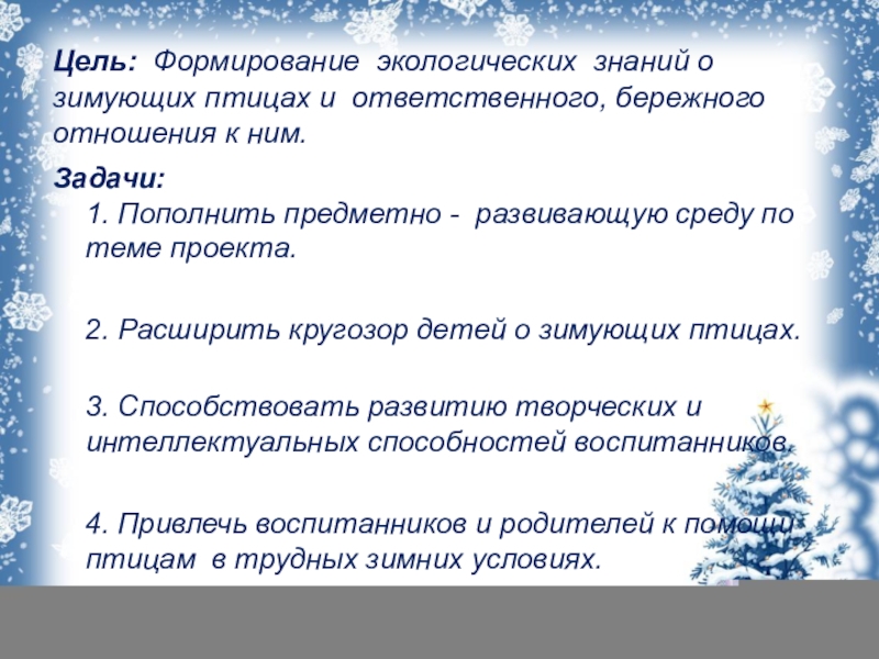 4. Привлечь воспитанников и родителей к помощи птицам в трудных зимних условиях.