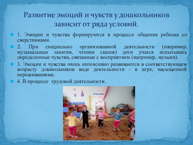 Развитие эмоций и чувств у дошкольников зависит от ряда условий.