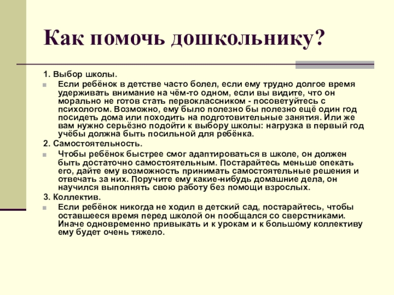 Чтобы ребёнок быстрее смог адаптироваться в школе, он должен быть достаточно самостоятельным. Постарайтесь меньше опекать его, дайте ему возможность принимать самостоятельные решения и отвечать за них. Поручите ему какие-нибудь домашние дела, он научился выполнять свою работу без помощи взрослых.