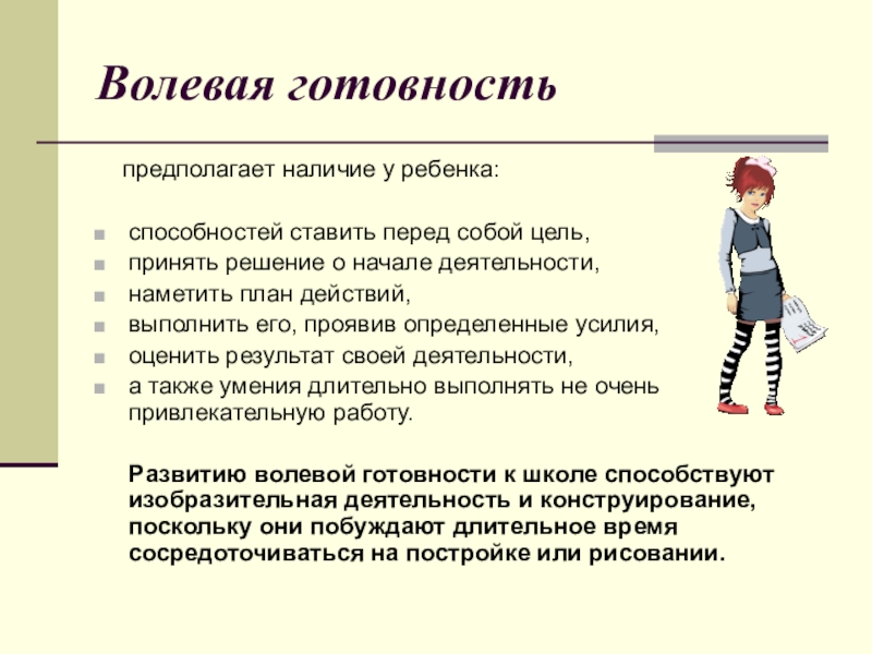 Развитию волевой готовности к школе способствуют изобразительная деятельность и конструирование, поскольку они побуждают длительное время сосредоточиваться на постройке или рисовании.