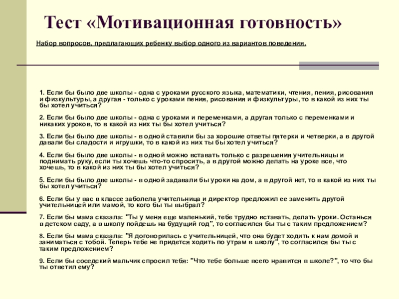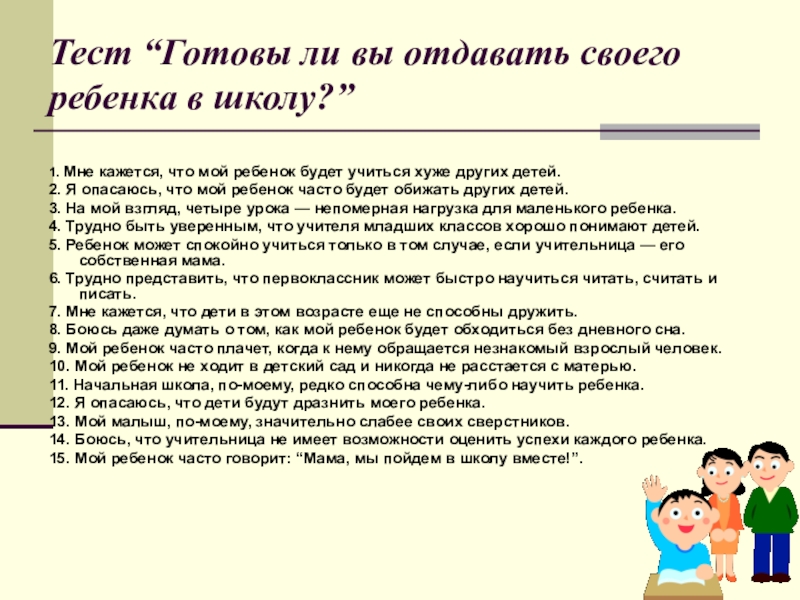 Слайд 2Тест “Готовы ли вы отдавать своего ребенка в школу?”