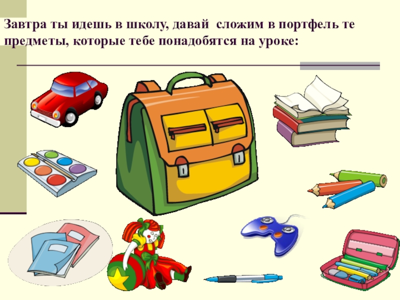 Слайд 10Завтра ты идешь в школу, давай сложим в портфель те предметы,