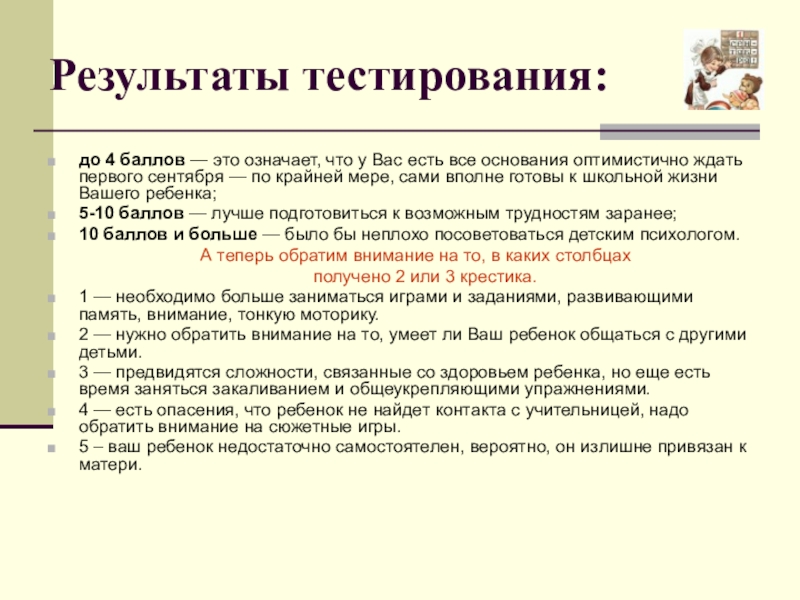 4 — есть опасения, что ребенок не найдет контакта с учительницей, надо обратить внимание на сюжетные игры.