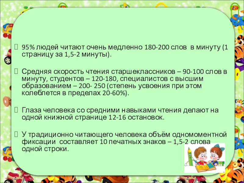 95% людей читают очень медленно 180-200 слов в минуту (1 страницу