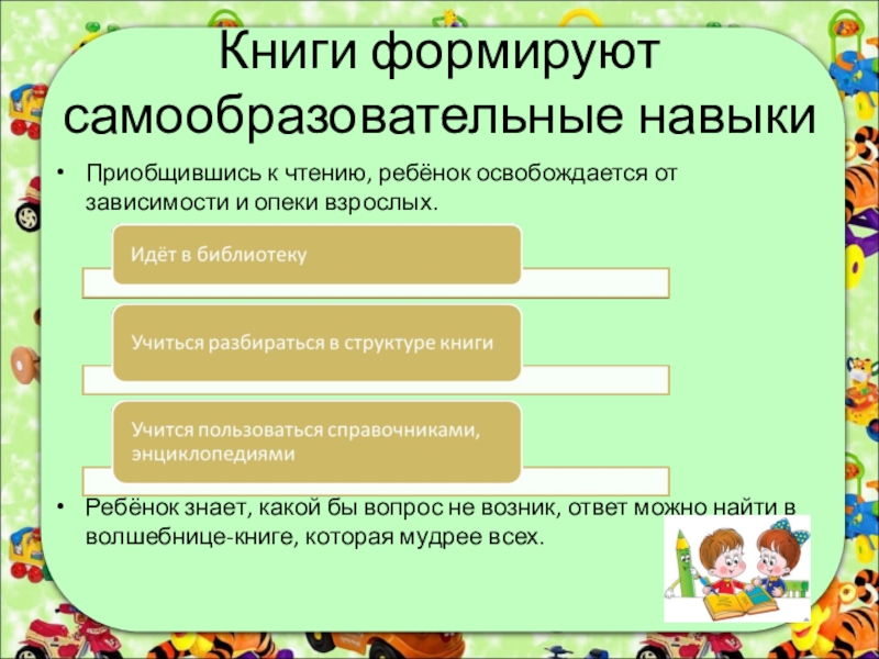 Ребёнок знает, какой бы вопрос не возник, ответ можно найти в волшебнице-книге, которая мудрее всех.