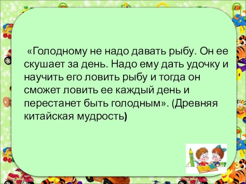 «Голодному не надо давать рыбу. Он ее скушает за день. Надо