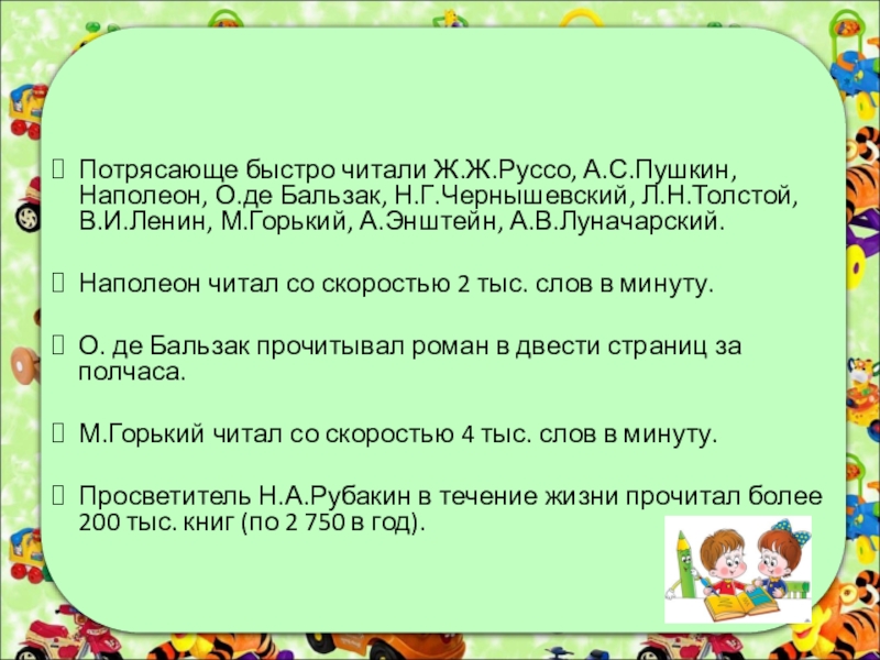 Потрясающе быстро читали Ж.Ж.Руссо, А.С.Пушкин, Наполеон, О.де Бальзак, Н.Г.Чернышевский, Л.Н.Толстой, В.И.Ленин,