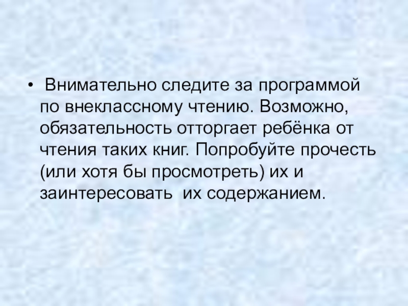 Слайд 10 Внимательно следите за программой по внеклассному чтению. Возможно, обязательность отторгает