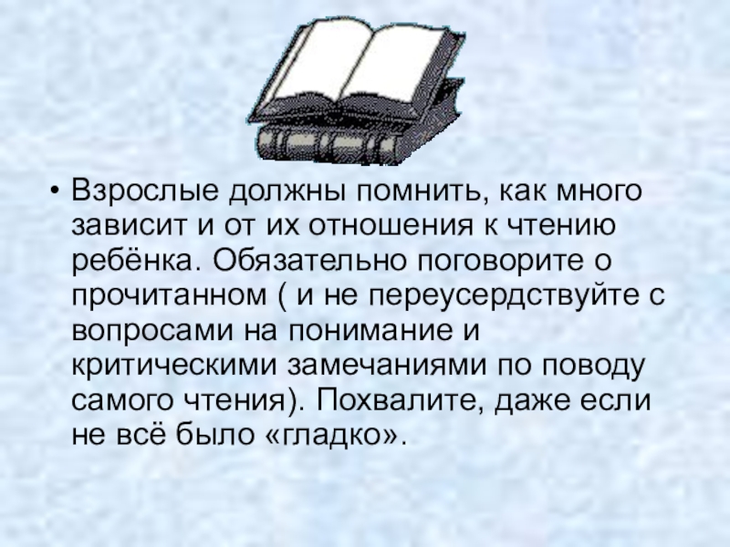 чтению ребёнка. Обязательно поговорите о прочитанном ( и не переусердствуйте с вопросами на понимание и критическими замечаниями по поводу самого чтения). Похвалите, даже если не всё было «гладко».