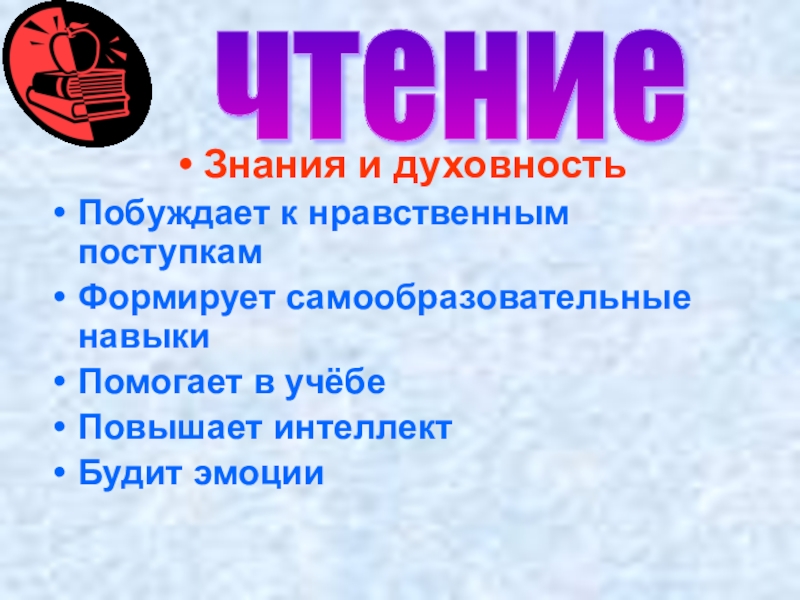 чтениеЗнания и духовностьПобуждает к нравственным поступкамФормирует самообразовательные навыкиПомогает в учёбеПовышает интеллектБудит эмоции
