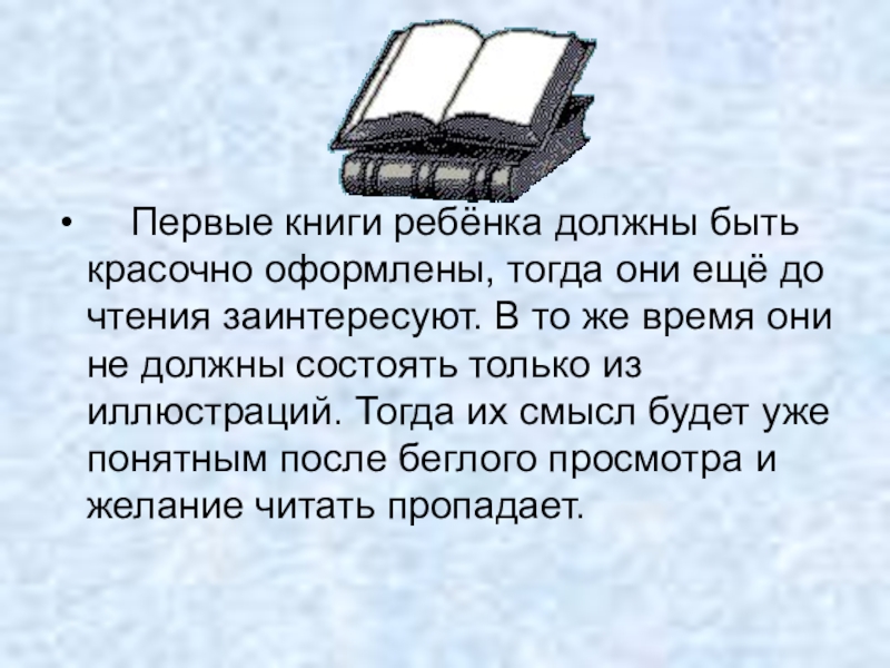 Первые книги ребёнка должны быть красочно оформлены, тогда они ещё до чтения заинтересуют. В то же время они не должны состоять только из иллюстраций. Тогда их смысл будет уже понятным после беглого просмотра и
