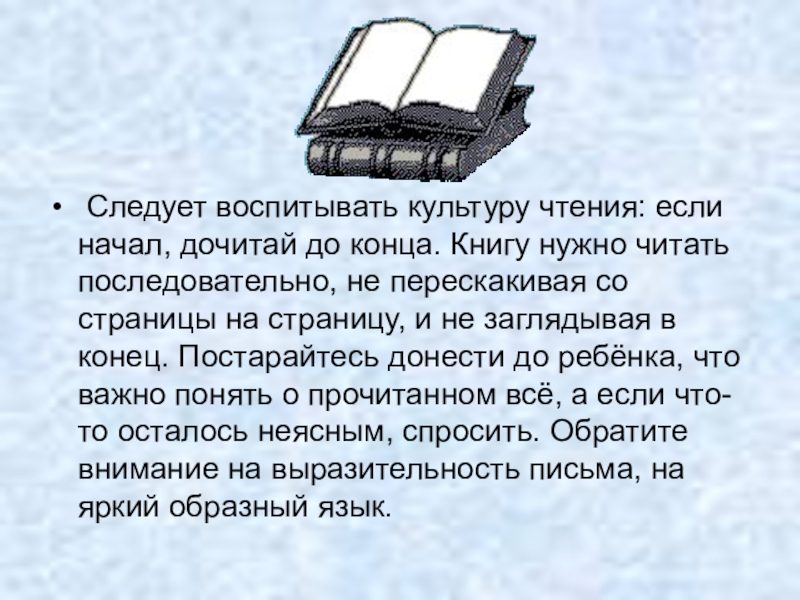 Следует воспитывать культуру чтения: если начал, дочитай до конца. Книгу нужно читать последовательно, не перескакивая со