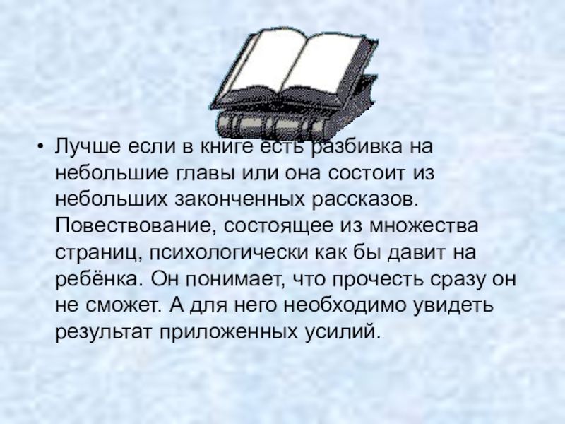 Лучше если в книге есть разбивка на небольшие главы или она состоит из небольших законченных рассказов. Повествование,