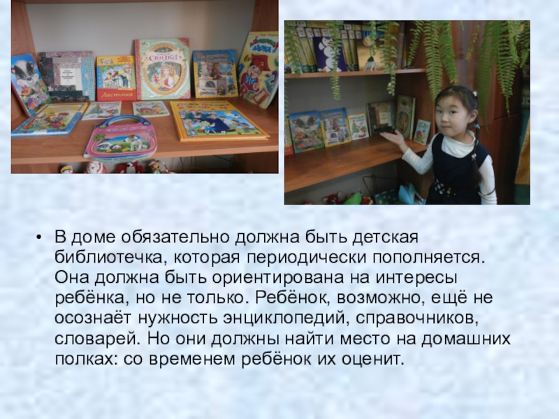Она должна быть ориентирована на интересы ребёнка, но не только. Ребёнок, возможно, ещё не осознаёт нужность энциклопедий, справочников, словарей. Но они должны найти место на домашних полках: со временем ребёнок их оценит.