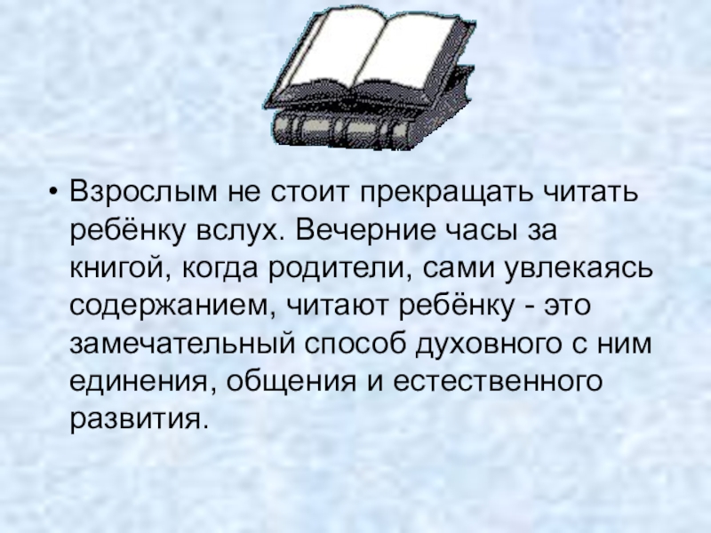 Взрослым не стоит прекращать читать ребёнку вслух. Вечерние часы за книгой, когда родители, сами увлекаясь содержанием, читают