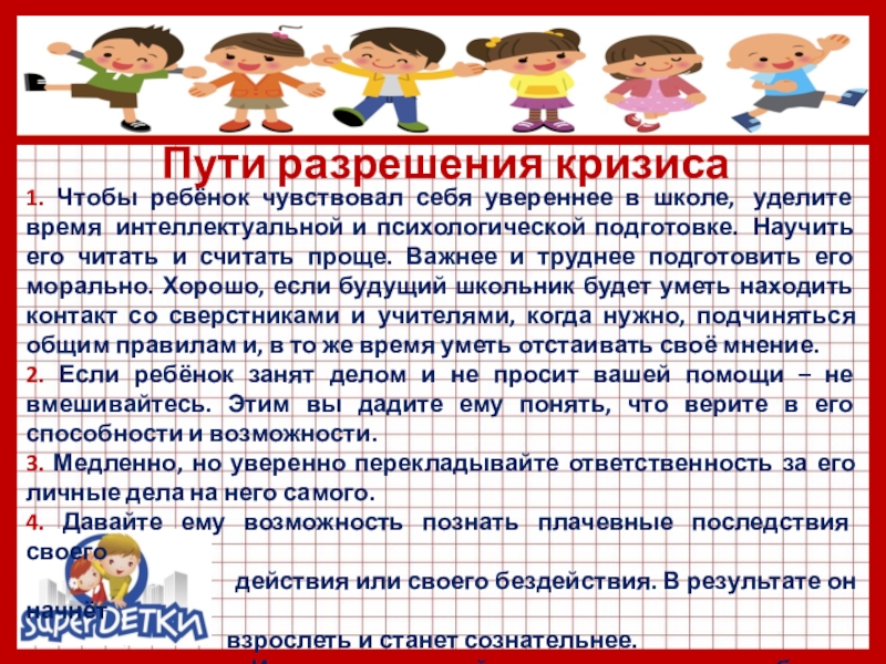 физиологических особенностей ребенка, от многих внешних факторов и условий. Он может быть совершенно незаметным и коротким, а может длительным, с яркими проявлениями всех его признаков. Правильное поведение и помощь родителей может сократить и продолжительность, и интенсивность этого периода.