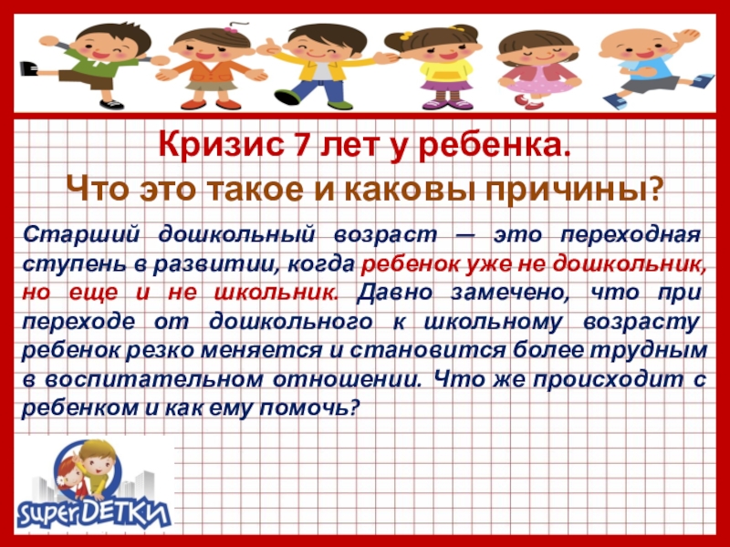 Старший дошкольный возраст — это переходная ступень в развитии, когда ребенок уже не дошкольник, но еще и не школьник. Давно замечено, что при переходе от дошкольного к школьному возрасту ребенок резко меняется и становится более трудным в воспитательном отношении. Что же происходит с ребенком и как ему помочь?