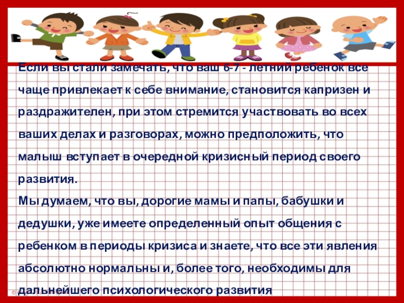 Мы думаем, что вы, дорогие мамы и папы, бабушки и дедушки, уже имеете определенный опыт общения с ребенком в периоды кризиса и знаете, что все эти явления абсолютно нормальны и, более того, необходимы для дальнейшего психологического развития