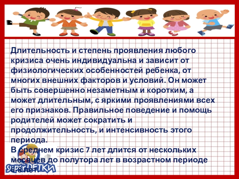 В среднем кризис 7 лет длится от нескольких месяцев до полутора лет в возрастном периоде 6-8 лет.