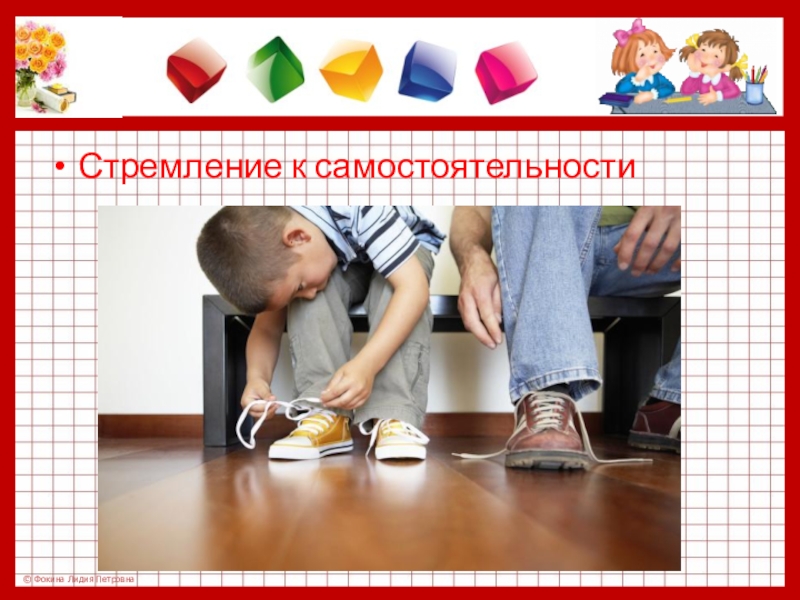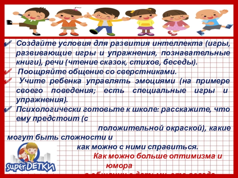 время интеллектуальной и психологической подготовке. Научить его читать и считать проще. Важнее и труднее подготовить его морально. Хорошо, если будущий школьник будет уметь находить контакт со сверстниками и учителями, когда нужно, подчиняться общим правилам и, в то же время уметь отстаивать своё мнение.