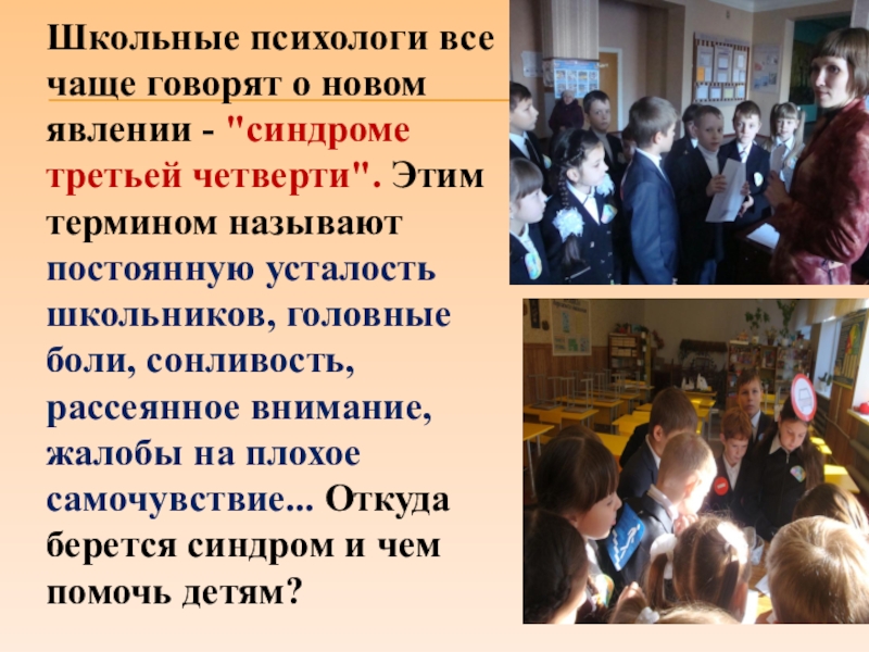 Школьные психологи все чаще говорят о новом явлении - "синдроме третьей четверти". Этим термином называют постоянную усталость школьников, головные боли, сонливость, рассеянное внимание, жалобы на плохое самочувствие... Откуда берется синдром и чем помочь детям?