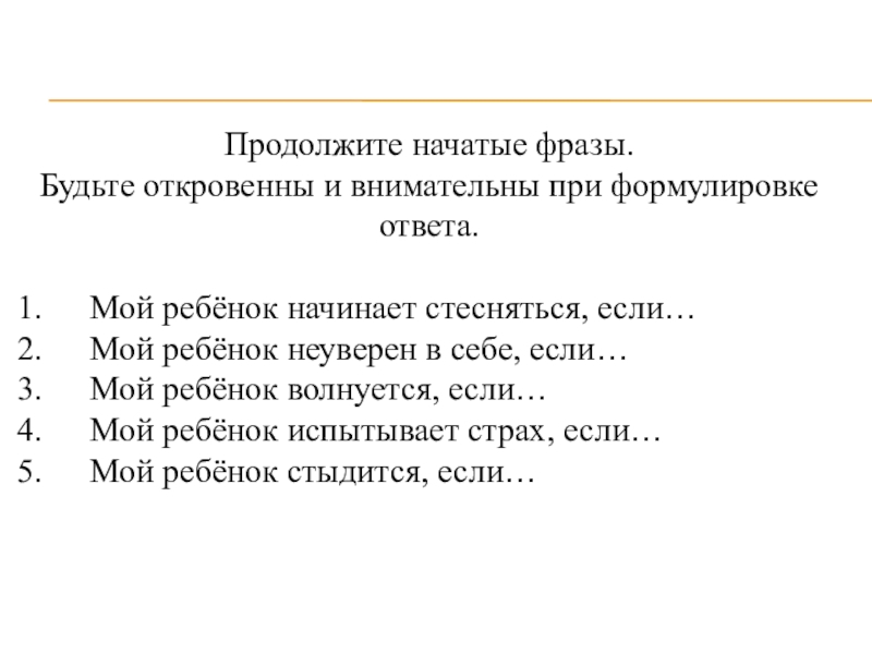 Продолжите начатые фразы. Будьте откровенны и внимательны при формулировке ответа. 1.     Мой ребёнок начинает стесняться, если…2.     Мой ребёнок неуверен в