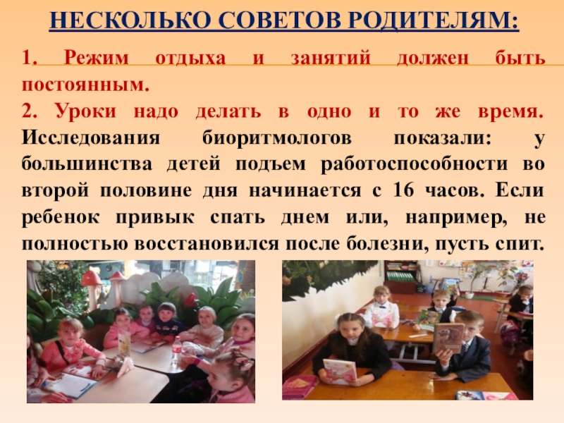 НЕСКОЛЬКО СОВЕТОВ РОДИТЕЛЯМ: 1. Режим отдыха и занятий должен быть постоянным. 2. Уроки надо делать в одно