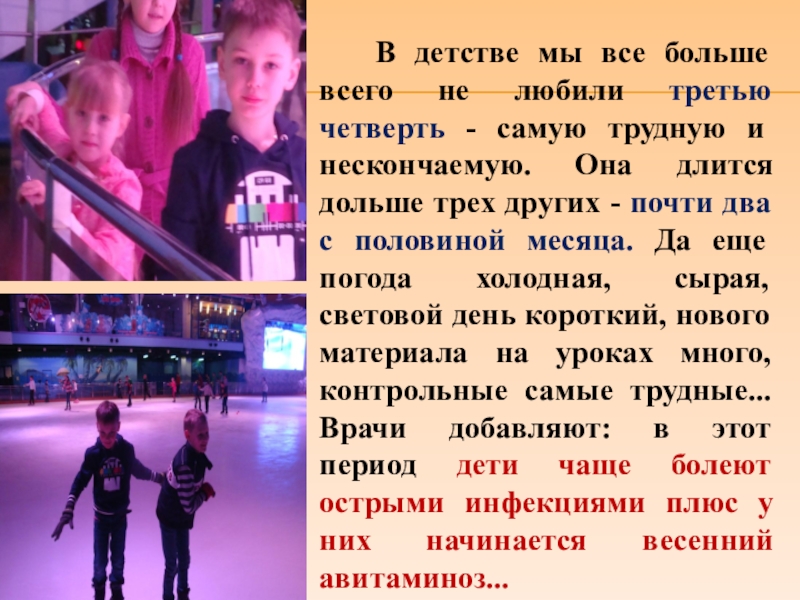 третью четверть - самую трудную и нескончаемую. Она длится дольше трех других - почти два с половиной месяца. Да еще погода холодная, сырая, световой день короткий, нового материала на уроках много, контрольные самые трудные... Врачи добавляют: в этот период дети чаще болеют острыми инфекциями плюс у них начинается весенний авитаминоз...