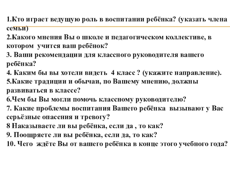 1.Кто играет ведущую роль в воспитании ребёнка? (указать члена семьи)2.Какого мнения Вы о школе и педагогическом коллективе,