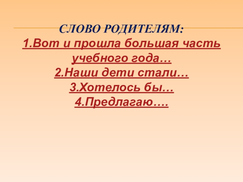 СЛОВО РОДИТЕЛЯМ:1.Вот и прошла большая часть учебного года…2.Наши дети стали…3.Хотелось бы…4.Предлагаю….