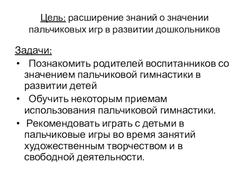 Слайд 2Цель: расширение знаний о значении пальчиковых игр в развитии дошкольников