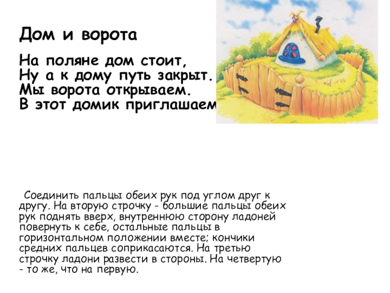 Соединить пальцы обеих рук под углом друг к другу. На вторую строчку - большие пальцы обеих рук поднять вверх, внутреннюю сторону ладоней повернуть к себе, остальные пальцы в горизонтальном положении вместе; кончики средних пальцев соприкасаются. На третью строчку ладони развести в стороны. На четвертую - то же, что на первую.