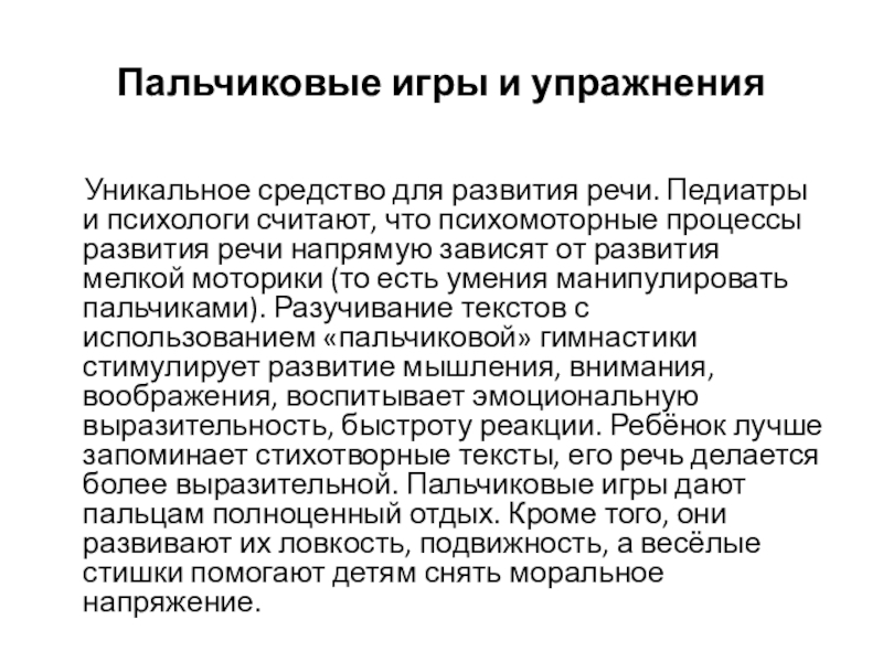 Педиатры и психологи считают, что психомоторные процессы развития речи напрямую зависят от развития мелкой моторики (то есть умения манипулировать пальчиками). Разучивание текстов с использованием «пальчиковой» гимнастики стимулирует развитие мышления, внимания, воображения, воспитывает эмоциональную выразительность, быстроту реакции. Ребёнок лучше запоминает стихотворные тексты, его речь делается более выразительной. Пальчиковые игры дают пальцам полноценный отдых. Кроме того, они развивают их ловкость, подвижность, а весёлые стишки помогают детям снять моральное напряжение.