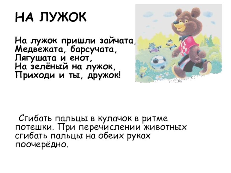 Сгибать пальцы в кулачок в ритме потешки. При перечислении животных сгибать пальцы на обеих руках поочерёдно.