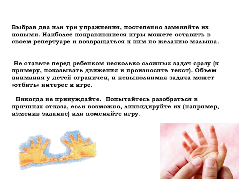 Не ставьте перед ребенком несколько сложных задач сразу (к примеру, показывать движения и произносить текст). Объем внимания у детей ограничен, и невыполнимая задача может «отбить» интерес к игре.