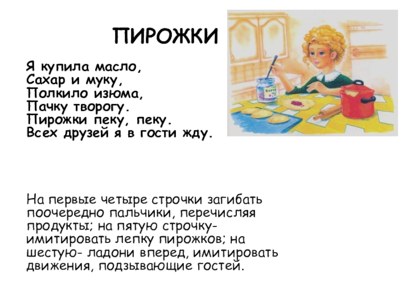 На первые четыре строчки загибать поочередно пальчики, перечисляя продукты; на пятую строчку- имитировать лепку пирожков; на шестую- ладони вперед, имитировать движения, подзывающие гостей.