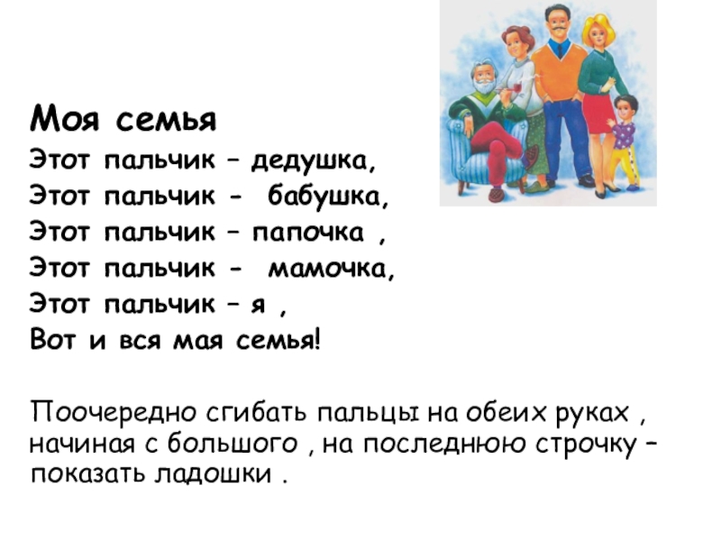 Поочередно сгибать пальцы на обеих руках , начиная с большого , на последнюю строчку – показать ладошки .