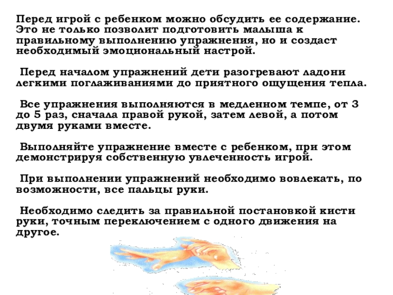Перед началом упражнений дети разогревают ладони легкими поглаживаниями до приятного ощущения тепла.