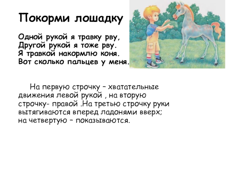 На первую строчку – хватательные движения левой рукой , на вторую строчку- правой .На третью строчку руки вытягиваются вперед ладонями вверх; на четвертую – показываются.