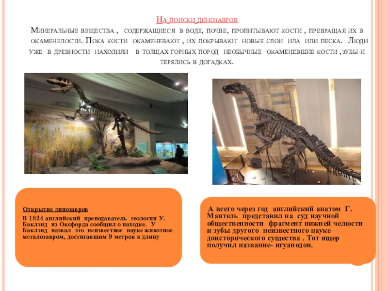 В 1824 английский преподаватель геологии У. Баклэнд из Оксфорда сообщил о находке. У Баклэнд назвал это неизвестное науке животное мегалозавром, достигавшим 9 метров в длину
