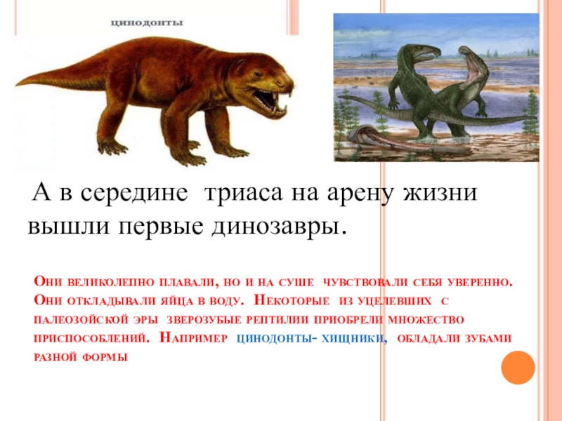 В начале триасового периода в озерах и болотах доживали свой век древние амфибии- закованные в броню лабиринтодонты - хищники, длина до 5 м