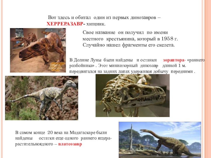 В Долине Луны были найдены и останки зораптора- «раннего разбойника» . Этот миниатюрный динозавр длиной 1 м. передвигался на задних лапах удерживая добычу передними .