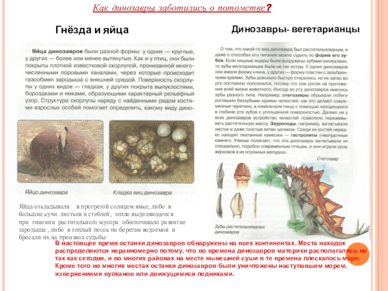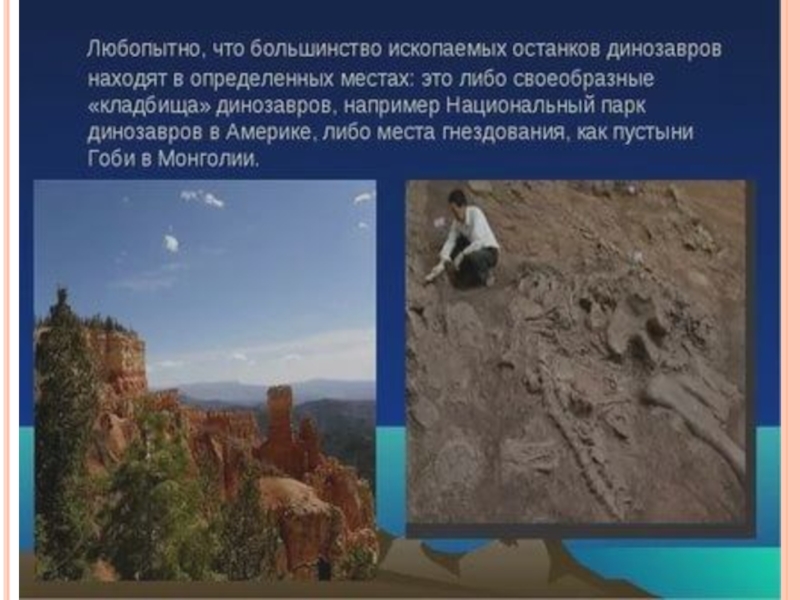 В настоящее время останки динозавров обнаружены на всех континентах. Места находок распределяются неравномерно потому, что во времена динозавров материки располагались не так как сегодня, и во многих районах на месте нынешней суши в те времена плескалось море. Кроме того во многих местах останки динозавров были уничтожены наступавшим морем, извержениями вулканов или движущимися ледниками.